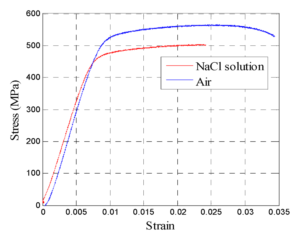Tensile stress–strain curves for aluminum alloy 7075-T651 in air and NaCl 3.5 wt %.