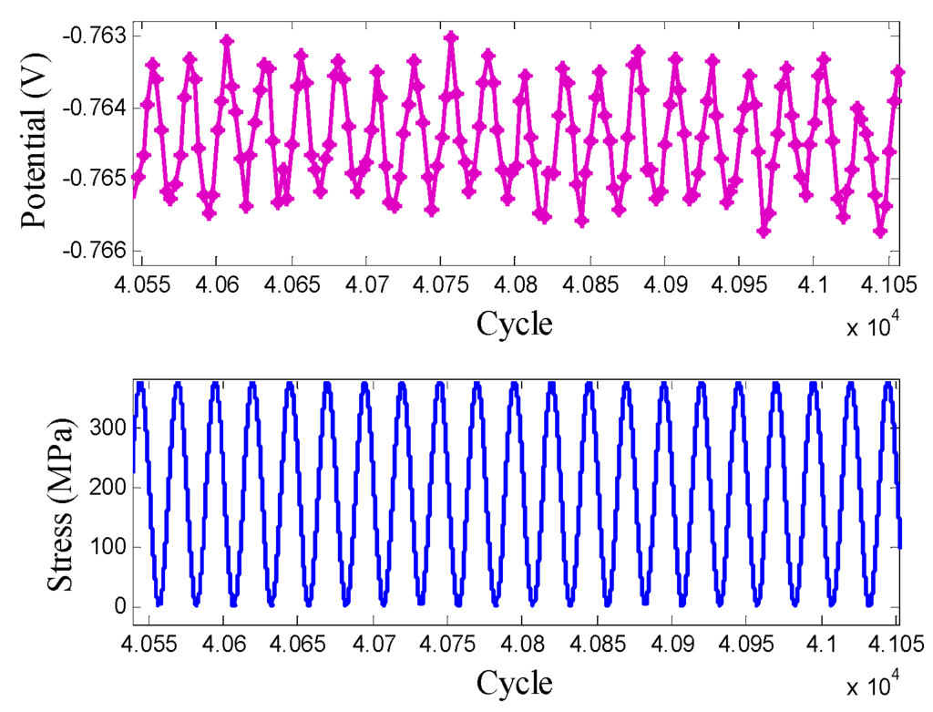 The corrosion fatigue tests were conducted while measuring the OCP variations during load/unload versus the unstrained RE. Figure 6 shows a dependence of OCP of a specimen under cyclic load as a result of mechano-chemical effect. According to the mechano-chemical effect, we can expect to observe an enhanced anodic dissolution flux induced by dynamic surface deformation. Meanwhile, the anodic current at the electrode surface can decrease near-surface work hardening and increase the mobility of dislocation, ultimately stimulating fatigue damage [14,15,58]. The strain response of electrode potential or work function has long been of interest in relation to a wide range of problems, including corrosion in structural materials under load [14,82,83,84] and coupling of electronic properties to stress in semiconductor devices [85,86], and to diffusion [87,88] and metallurgy [89]. Gutman [14] and Sahal et al. [84] suggested that the local value of the chemical potential in the liquid/solid system is defined only by the absolute value of the hydrostatic part of the stress tensor, , and is independent of the deviatory part of the stress. Using the solid incompressibility hypothesis [14], the potential difference caused by stress is given by:
