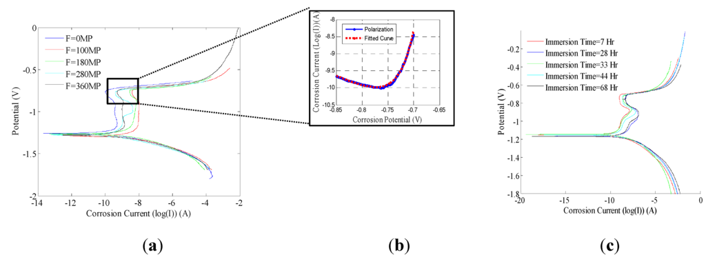 (a) Polarization curves at different stress levels; (b) the corrosion current as a function of potential was obtained by fitting the sum of two exponential functions to the interval of potential values corresponding to OCP variations during corrosion fatigue tests; (c) polarization curves after different immersion time periods.