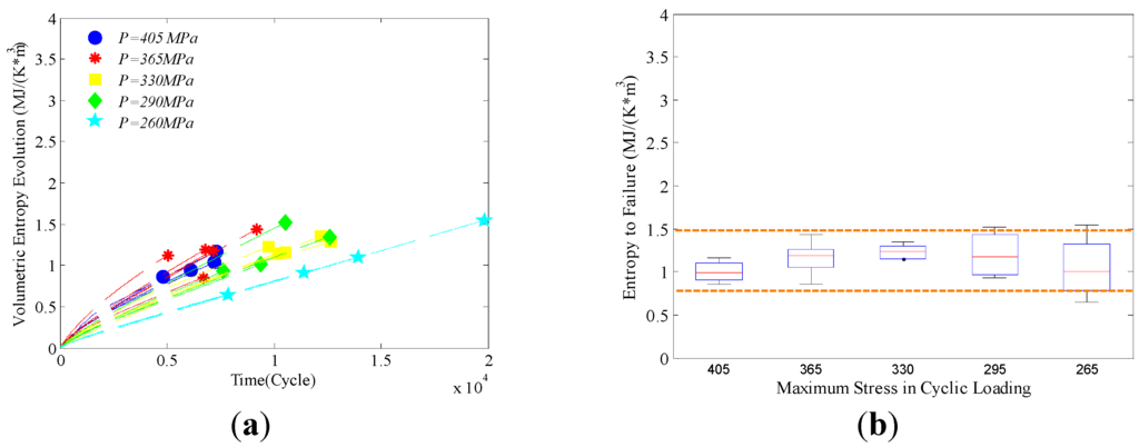 (a) Cumulative entropy evolutions at different loading conditions; (b) box plot of fracture entropies (entropy to failure) at each loading condition where boxes represent the interval of fracture entropy distributions, and mid lines reflect the mean of fracture entropies at each loading condition.