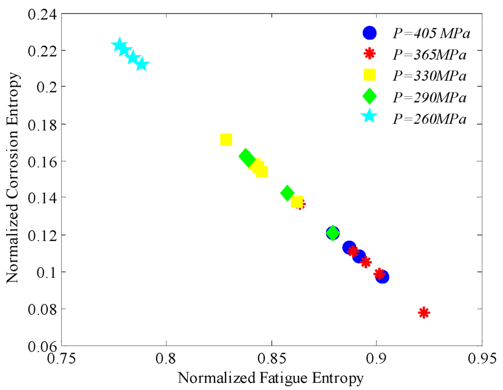 Normalized corrosion entropy versus normalized fatigue entropy.