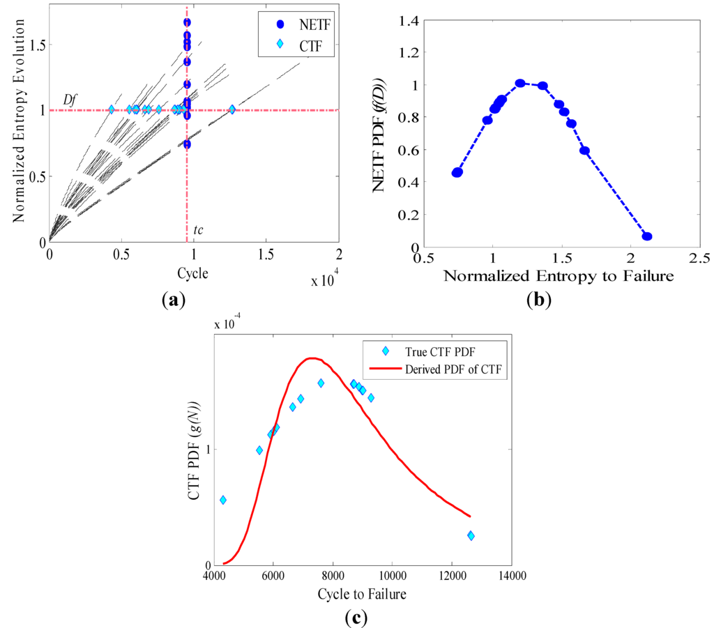 (a) Normalized entropy evolution of aluminum specimens; filled diamond and filled circles show the CTF and NETF; respectively. (b) Weibull distribution function was fitted to the NETF; (c) derived PDF of CTF based on NETF PDF versus true CTF distribution.