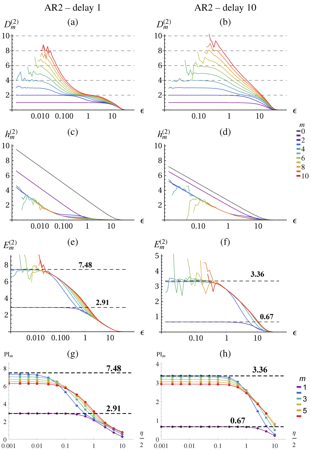 Analysis of an AR-model () of the Lorenz attractor observed at delay 1 and delay 10. See Figure 2 for details. (a,b) The dimensionality corresponds to the embedding dimension (as long as the data suffices). (c,d) Conditional entropies show the entropy of the noise for . The difference between first and second, and second and third embedding reveal the actual structure of the time-series, better visible in (e) and (f). (e,f) The excess entropy converges to the theoretical values of for and to for (delay 1) and for and to for (delay 10). (g,h) Predictive information estimated with KSG algorithm with .