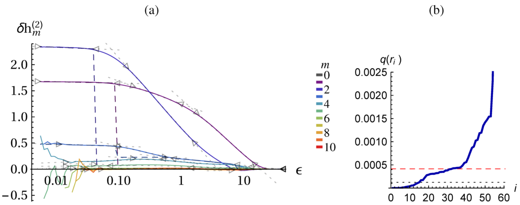 where is the “ball” at with radius ε. For Equation (32) becomes . The integral in this formula is also known as “correlation integral”. For N data points it can be estimated using the correlation sum, which is the averaged relative number of pairs in an ε-neighborhood [36,37],