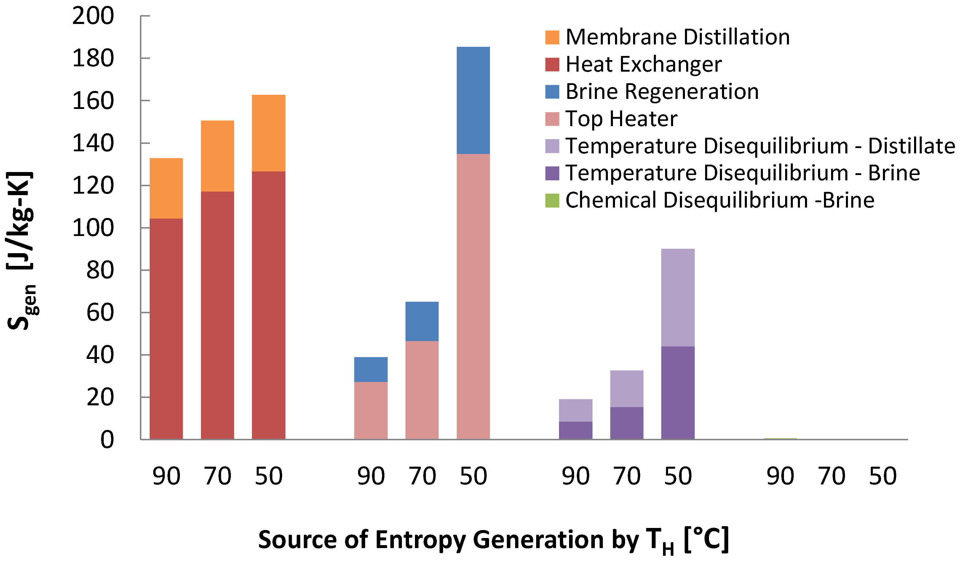 , significantly more entropy is generated per kilogram product water produced. For example, in MSF the entropy generation in the brine heater went from minor to being the largest contribution. In all thermal technologies, the reduced recovery causes an increase in entropy generation for temperature disequilibrium of the brine, again since a larger volume of brine is mixing with the ocean water. This relative flow rate effect also increased the entropy generation in the condenser for MED. The reduced recovery is a natural feature of lower source temperature systems, and is difficult to reduce as that would require increased performance and investment in the stage components, increasing the stage number and reducing temperature differences in the stage heat exchangers. As the stage performance changes little at lower temperature, while other components perform much worse, it hardly makes sense to focus investment in the stages, further limiting the ability to increase recovery with lower temperature heat sources. The lower temperatures also performed worse because at lower temperatures, more entropy is generated by heat transfer across a temperature gradient, as made apparent by the equation for