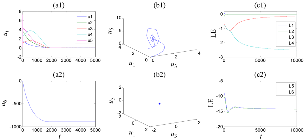 Fixed point (). (a1) Waveforms of –; (a2) waveform of ; (b1) phase portrait of transient state; (b2) phase portrait of steady state; (c1) Lyapunov exponents of –; (c2) Lyapunov exponents of – .