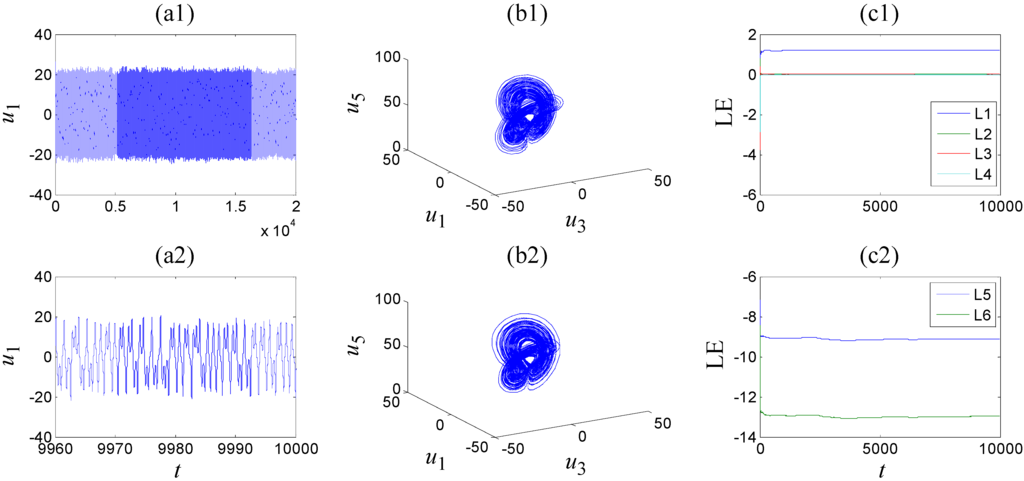 Chaos (). (a1) Waveform of; (a2) subinterval waveform of ; (b1) phase portrait of transient state; (b2) phase portrait of steady state; (c1) Lyapunov exponents of –; (c2) Lyapunov exponents of –.