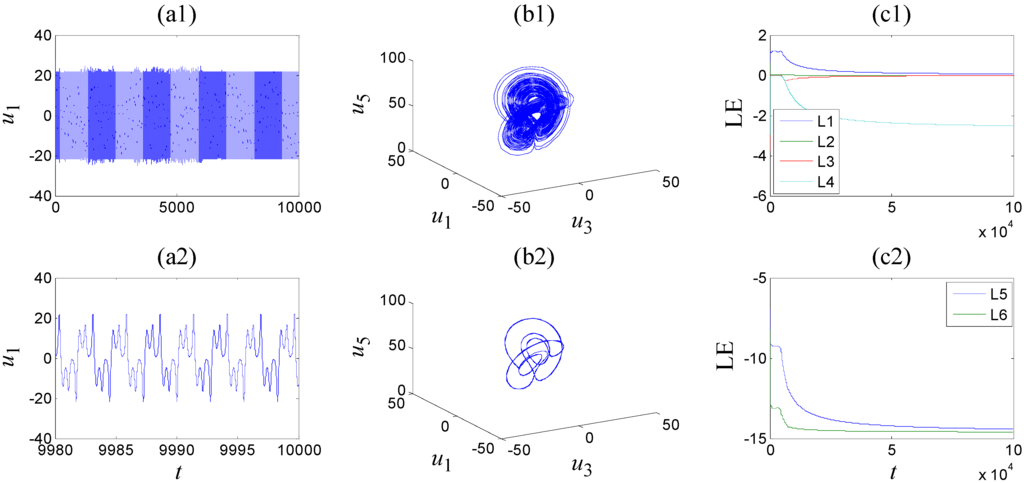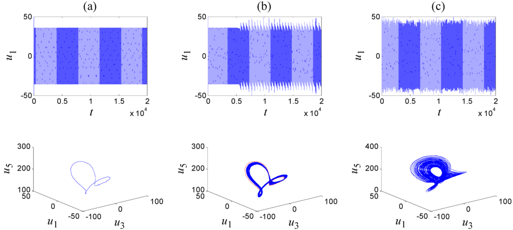 By fixing a1 = 8, a2 = 11, a3 = 163, a4 = 8/3, α = 0.67 × 10−3, β =0.02 × 10−3, u(0) = (2, 0, 1, 4, 0.1, u6(0)), and choosing different , we plot time-domain waveforms and phase portraits for system (6) as shown in Figure 9. The figure indicates that the system operates periodically or chaotically with different initial values of ; for example, Period-1 limit cycle, Period-1 (red cycle in Figure 9b) to torus, and chaos are found as shown in Figure 9.