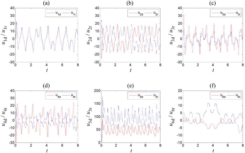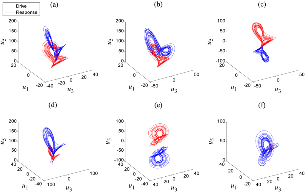 To demonstrate the validity of the above-mentioned MPS scheme, we provide numerical simulation results between two identical memristor-based complex Lorenz systems. The parameters and initial conditions are selected as a1 = 8, a2 = 11, a3 = 50, a4 = 8/3, α = 0.67 × 10−3, β =0.02 × 10−3, ud(0) = (2, −3, 3, −2, 3, 2), ur(0) = (−1, −1, 0, 0, 0, −1), which can guarantee the drive system operating chaotically. When the projective factors , the results are illustrated in Figure 10, Figure 11 and Figure 12, which consistently indicate that MPS is achieved within a short time. In detail, Figure 10 presents time-domain waveforms of the drive system (12) and the response system (13), Figure 11 shows that synchronization errors eventually converge to zero within five seconds, and Figure 12a displays phase portrait of phase space. Furthermore, we investigate the MPS under different scaling factors. When , MPS is achieved as shown in Figure 12b. When and , projective synchronization (PS) is achieved as shown in Figure 12c,d. When , anti-synchronization (AS) is achieved as shown in Figure 12e. When , complete synchronization (CS) is achieved as shown in Figure 12f.