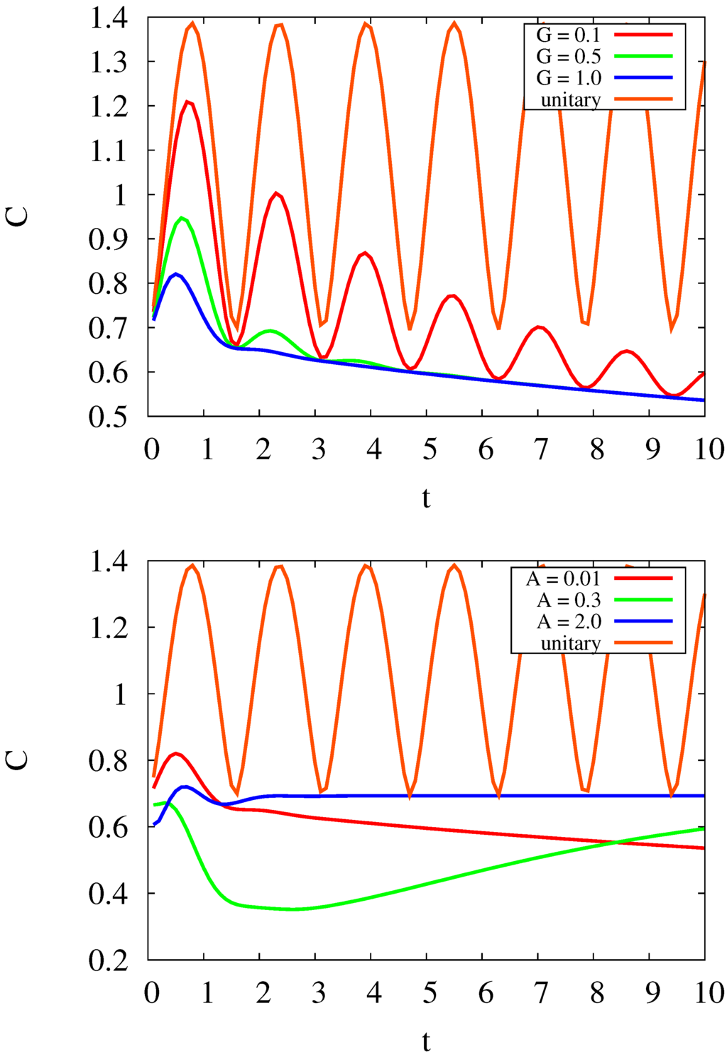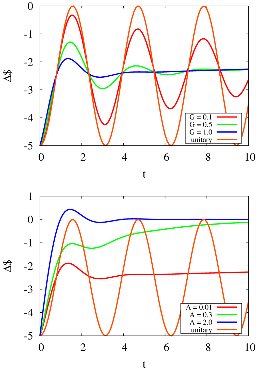 In the lower panel of Figure 3, we present an effect of energy dissipation. As for the pure decoherence, has the biggest value for the unitary evolution at any time t, but in this case, for dissipating systems firstly exhibits a deep minimum and then increases to its asymptotic value (contrary to decohered systems, where decreases asymptotically). This is correlated with the fact that payoffs for these systems are more often bigger than governed by unitary evolution. This is especially seen for the extreme example, discussed before, for , where payoffs are always bigger than for unitary evolution and the relative entropy before quick dampingof oscillations (as in pure decoherence) passes through the minimum, which results in an increase of payoff values (which was not seen for the decohered system). In other words, we can say that dampingof oscillations “freezes” the value of payoffs, either for pure decoherence and with dissipation, but later, deep initial loss of coherence results in an increase of the payoffs. Let us also emphasize that increasing A does not influence the long time properties of .