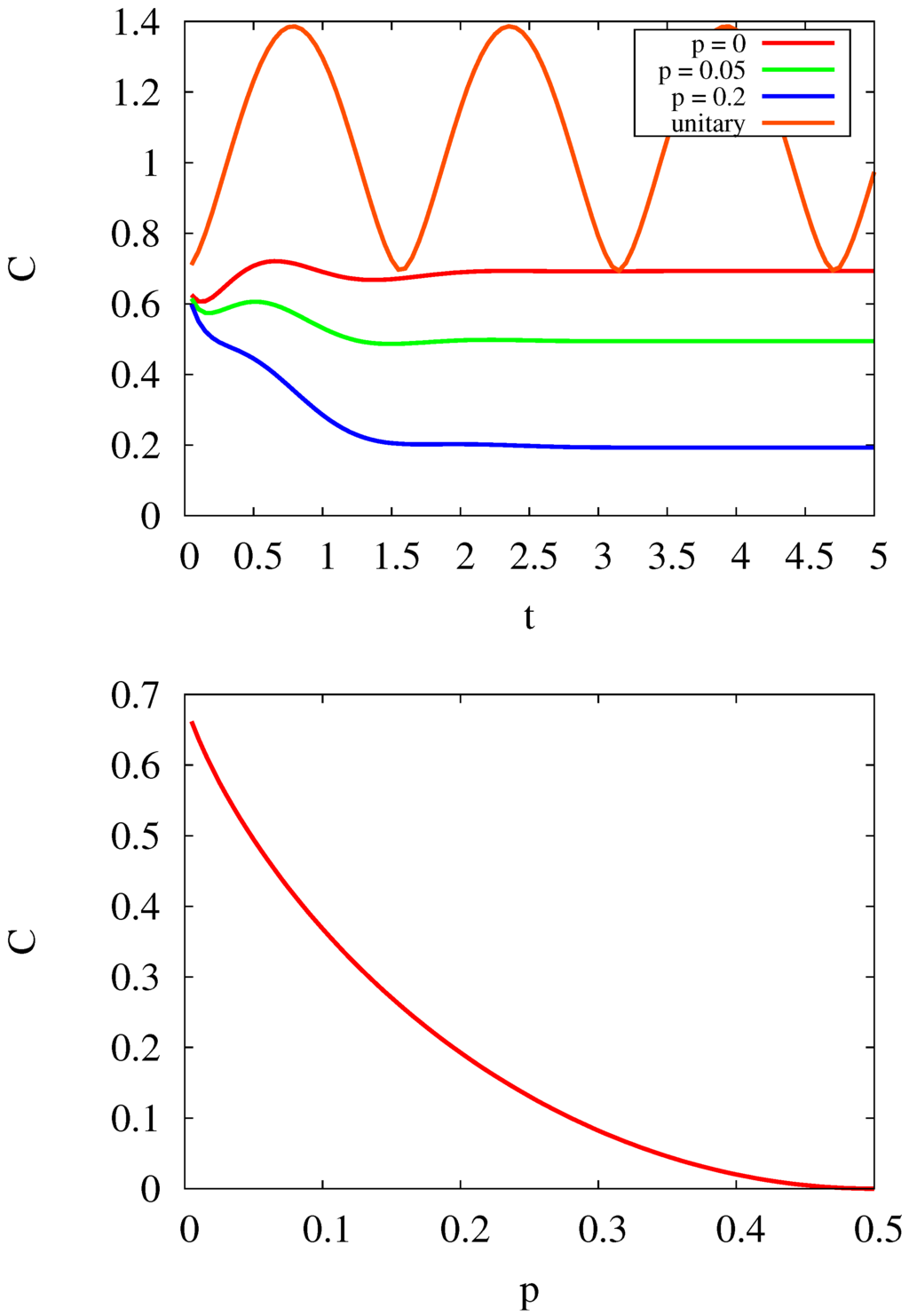The asymptotic value of is strongly affected by the temperature p of the environment. In other words, one can control and design desired value of coherence at a given time instant just by a proper choice of the properties of the environment. The results presented in Figure 4 confirm the natural expectation that increasing of p causes the decreasing of coherence. In particular, for an infinite temperature , coherence , as presented in the lower panel of Figure 4.