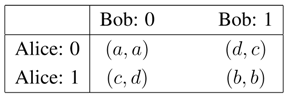Here, Bob and Alice are the players who can adopt two strategies denoted by zero and one. In general, the strategies denoted by zero and one may consist of different “physical actions” for the players in question! The payoffs of Alice and Bob are given by ordered pairs corresponding to the strategies that they adopted. Such a general game becomes reduced to the prisoner’s dilemma provided that parameters in payoff Equation (8) fulfill the relation [27]. Its quantum extension is no less popular, at least as a theoretical tool, cf. [9,28]. It was formulated in the seminal paper [5] and later generalized to various types of networks problems [29,30]. In the quantum version, the game ceases to be paradoxical for some classes of quantum strategies, but we should stress here that the dilemma disappears due to dramatic enlargement of the set of strategies for both agents. Therefore, the quantum prisoner dilemma is a quite new game that reduces the classical one only if the strategy sets are properly reduced.