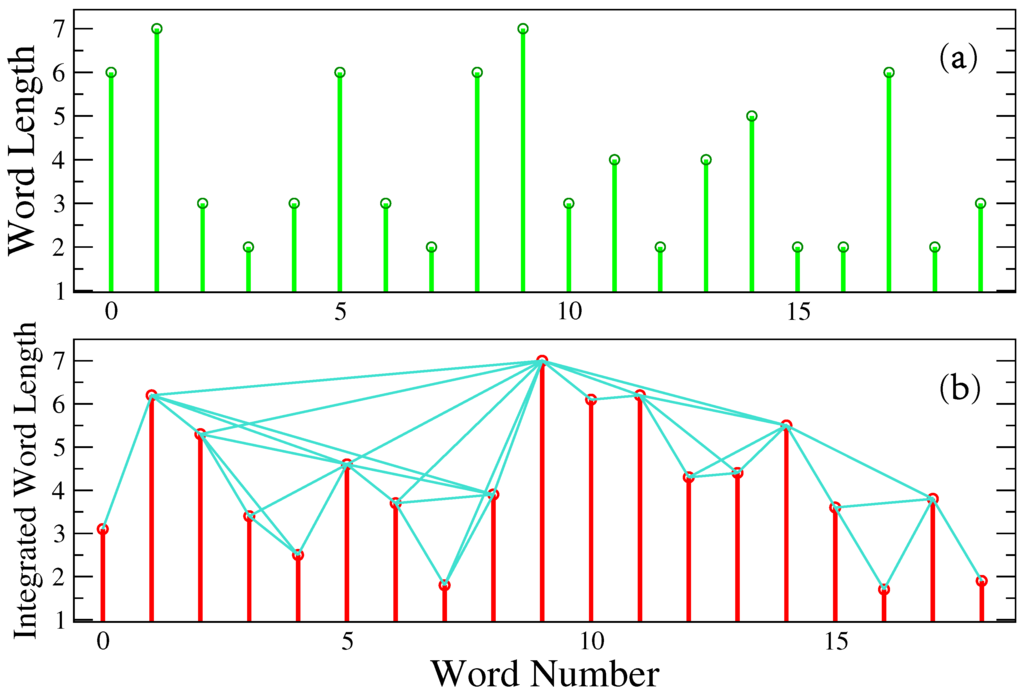 We consider the sequences of word- length obtained from the 30 books described above. We emphasize that the word length is given in terms of the number of letters forming a word. First, we notice that a direct application of the NVG to the word length sequences reveals that the NVG is highly inaccurate at capturing temporal correlation/organization structures in signals close to the transition from anti-persistent to persistent behavior [23]. For a more reliable application of the NVG to the word-length data, the sequence is first integrated to obtain the profile, , where is the j-th word length, is the mean value and (see Figure 2). In this way, the integrated signal is within the fractional Brownian motion regime, and the NVG provides more reliable information of the emerging networks by means of, for example, quantities, like the degree distribution.