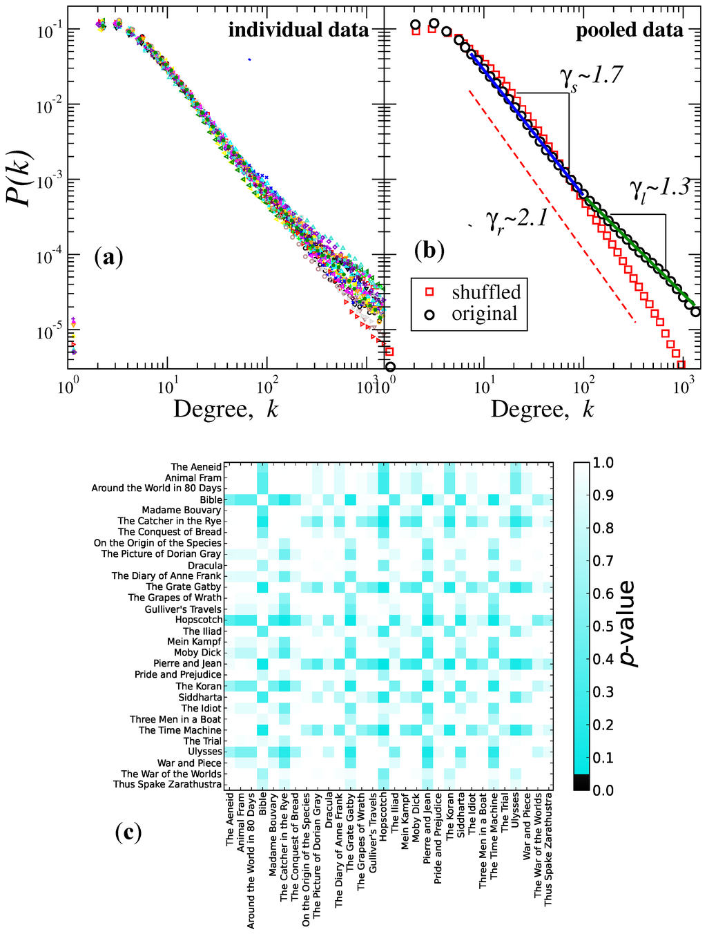 Visibility graph method (natural visibility graph (NVG)) analysis. Degree distributions of the degree probability versus the degree k of the number of visible connections from the graph of the integrated word-length sequences. (a) Log-log plot of vs. k of individual data. We observe that each book follows an overall function of the form , but with two apparent regimes having different exponents. (b) As in (a), but for pooled original and shuffled data. The original data follow a power-law function with two regimes separated by the degree scale value ; over short degree values, the scaling exponent is , while for large scales, . We also show the distribution from shuffled data, and we observe that they follow a power law with exponent value . (c) The matrix of p-values from the application of the Kolmogorov–Smirnov (K-S) test to all pairs of individual distributions shown in (a). We observe that at the level of significance, for all of the books in our dataset, we cannot reject the null hypothesis that any pair of books has the same distribution. Therefore, we can pool the degree data from all of the texts and improve the statistics.