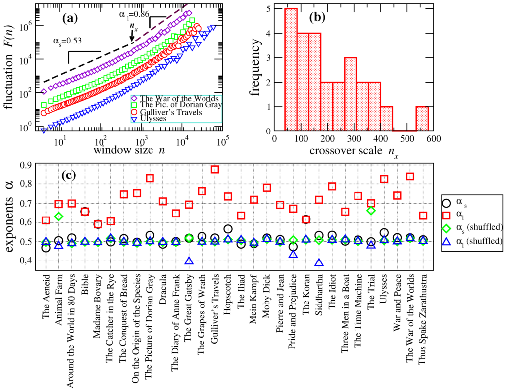 Detrended fluctuation analysis (DFA). Correlation exponents and of the detrended fluctuation analysis (DFA) for the books in the dataset. (a) Plots of vs. n for four representative cases of crossover scaling in word-length sequences from the books The Picture of Dorian Grey, Gulliver’s Travels, Ulysses and The War of Worlds. Two regimes in the exponent values are identified, and they are separated by the crossover scale , as is indicated. (b) Histogram of crossover scale position for the DFA data. Most of the cases lie between the range of a 50–400 window size. (c) Correlation exponents α for the 31 books in our study. Here, the exponents’ values were determined by means of two linear fittings for which the error is minimum (see the text for details). For most cases, the scaling exponents () from the small scales (squares) are close to that for the randomized data from the small and large scales (diamonds, triangles), indicating that there are no significant correlations in word lengths at small distances between the words. This contrasts with the behavior of most of the data at large scales (squares), where () indicates the presence of positive long-range correlations. However, for three books, The Bible, Madame Bovary and The Koran, the exponent values, and , at both small and large scales, are the same.
