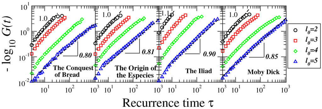 Recurrence time analysis. Plot of versus. recurrence time τ for four representative books in our study. We show the cases of threshold values (circles), (squares), (diamonds) and (triangles). The exponent here represents the single exponential case, while is a stretched exponential distribution. Consistent with the NVG and DFA analysis in Figure 3 and Figure 4, the exponent b is closer to one, indicating no memory effects in word length for small values and indicating the presence of memory in return intervals of large word-length values.