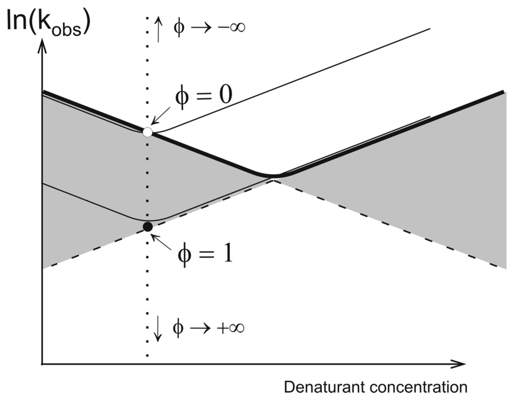 Scheme of the experimental identification of involvement of a residue in the folding nucleus using the Φ-analysis of site-directed mutations. The wild type chevron plot is drawn in bold. The dashed lines denote extrapolations of processes to conditions where they are non-observable in experiment (folding at high denaturant concentration and unfolding at low denaturant concentration). Closed circle: The mid-transition point for chevron plot of a mutant protein if the mutated residue has its native conformation and environment (i.e., its native interactions) already in the folding nucleus; in this case Φ = 1. Open circle: The mid-transition point for chevron plot of a mutant protein if the mutated residue remains denatured in the transition state; in this case Φ = 0. If the mid-transition point moves from the open circle to the closed circle, the corresponding Φ-value changes from 0 to 1. If the mid-transition point moves up from the open circle, then Φ → −∞; if the mid-transition point moves down from the closed circle, then Φ → +∞. The grey region corresponds to the positions of mid-transition points when 0 ≤ Φ ≤ 1.