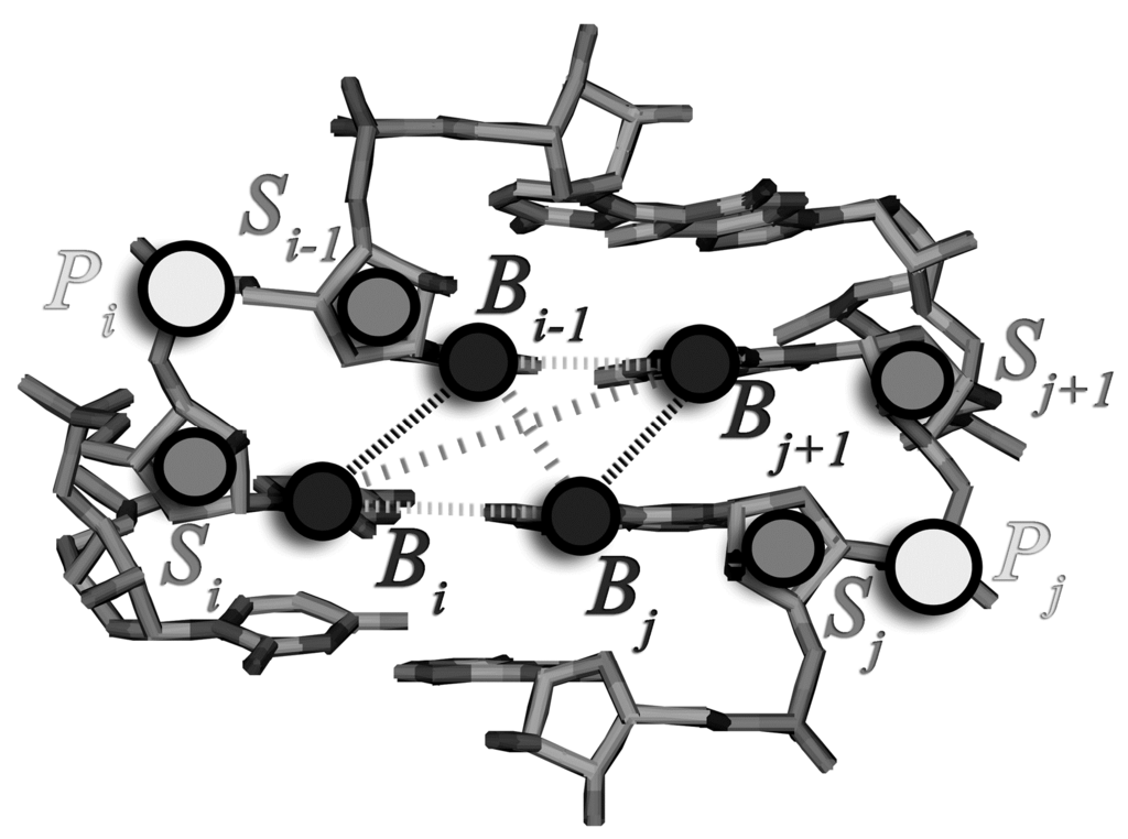 Coarse-grained RNA structural model. Beads in the RNA: sugar (S), phosphate (P), and base (B). Distances vary depending on the type of the nucleic base in the nucleotide. Hydrogen bonds upon interactions of the bases. Pairing contacts are shown between bases Bi−1:Bj+1 and Bi:Bj.