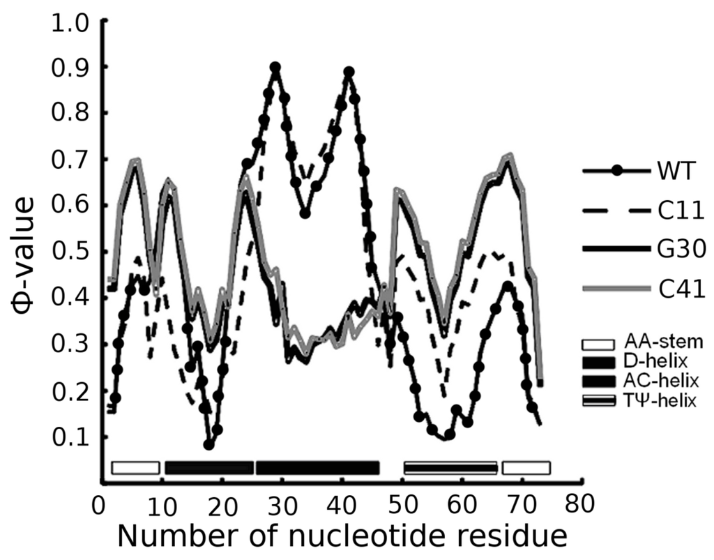 To reveal the importance of certain nucleotides in the folding nucleus, we removed some nucleotides corresponding to high Φ-values. “To remove” means to excise the base atoms of the chosen nucleotide from the native RNA structure. We suppose that the pronounced change in the profile will appear only if the removed base exists in the folding nucleus. It is well seen on the example of the tRNAPhe molecule (PDB file: 3L0U) how the Φ-value profiles change after removal of G30 and C41 from the AC helix. Only minor changes were observed upon removal of base C11 from the D loop (Figure 7). As seen in the Figure, the folding nucleus is mainly localized in the anticodon hairpin region. These two cases show that a slight change in local stability of tRNA (~1 kcal/mol) is able to significantly change the pathway and, correspondingly, the nucleus of tRNA folding. This situation is similar for tRNA molecules crystallized in the bound state.