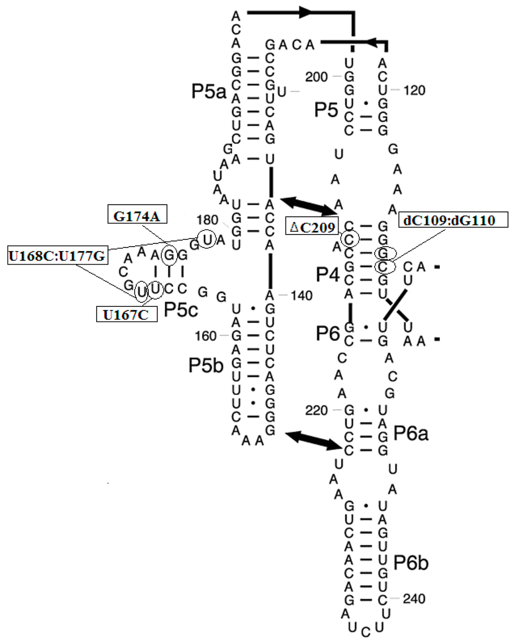 To identify the nucleotides included in the folding nucleus and affecting the folding of P4-P6, several mutations were introduced into the domain (Figure 8). The Φ-values were determined based on the changes in the free energies of folding and the stable state. In spite of some thermodynamic differences, the folding rates of wild-type and mutated P4-P6 were similar. At the same time, the fact that Φ ~ 0 indicates that, in the transition state, these nucleotides had not yet formed their native contacts.