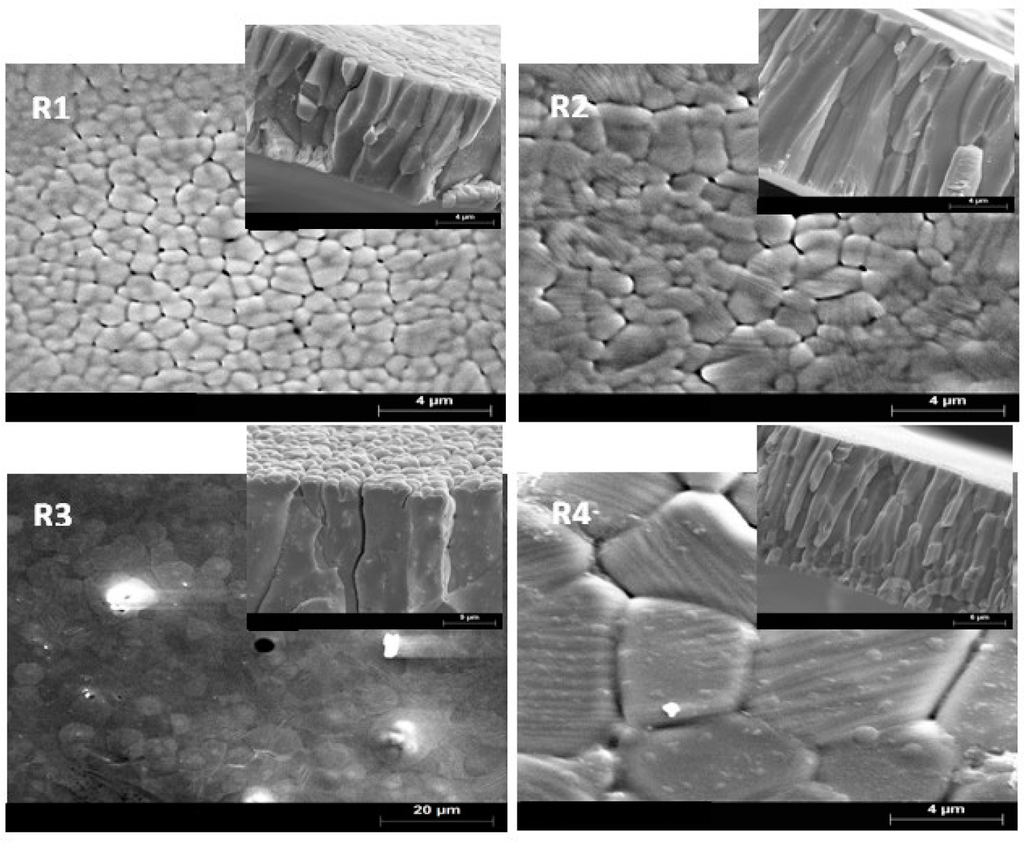 SEM micrographs showed differences in the thickness and grain size, which seem to be influenced by the processing parameters. Figure 1 shows the SEM micrographs of the free surface and fracture morphology (insets) of the various Mn49.3Ni43.7Sn7.0 ribbons: (a) R1, (b) R2, (c) R3 and (d) R4. Table 1 also lists the chemical compositions obtained by EDX measurements. From EDX analysis, the average composition of the four alloys is Mn49.3Ni43.7Sn7.0. The standard deviation obtained for the elemental chemical composition (as determined by EDX) was 0.4–0.6 at% for Ni, 0.4–0.6 at% for Mn, and 0.3–0.5 at% for Sn. One parameter used to characterize magnetic shape memory alloys is the electron-to-atom ratio (e/a) that is calculated using the electron concentration of the outer shells for each element of the Ni-Mn-Sn alloy. The number of electrons per atom (e/a ratio) for Ni, Mn, Sn atoms are 10(3d8, 4s2), 7(3d5, 4s2) and 4(5s2, 5p2). The following expression is used to calculate e/a ratios as described in detail in [14]:
