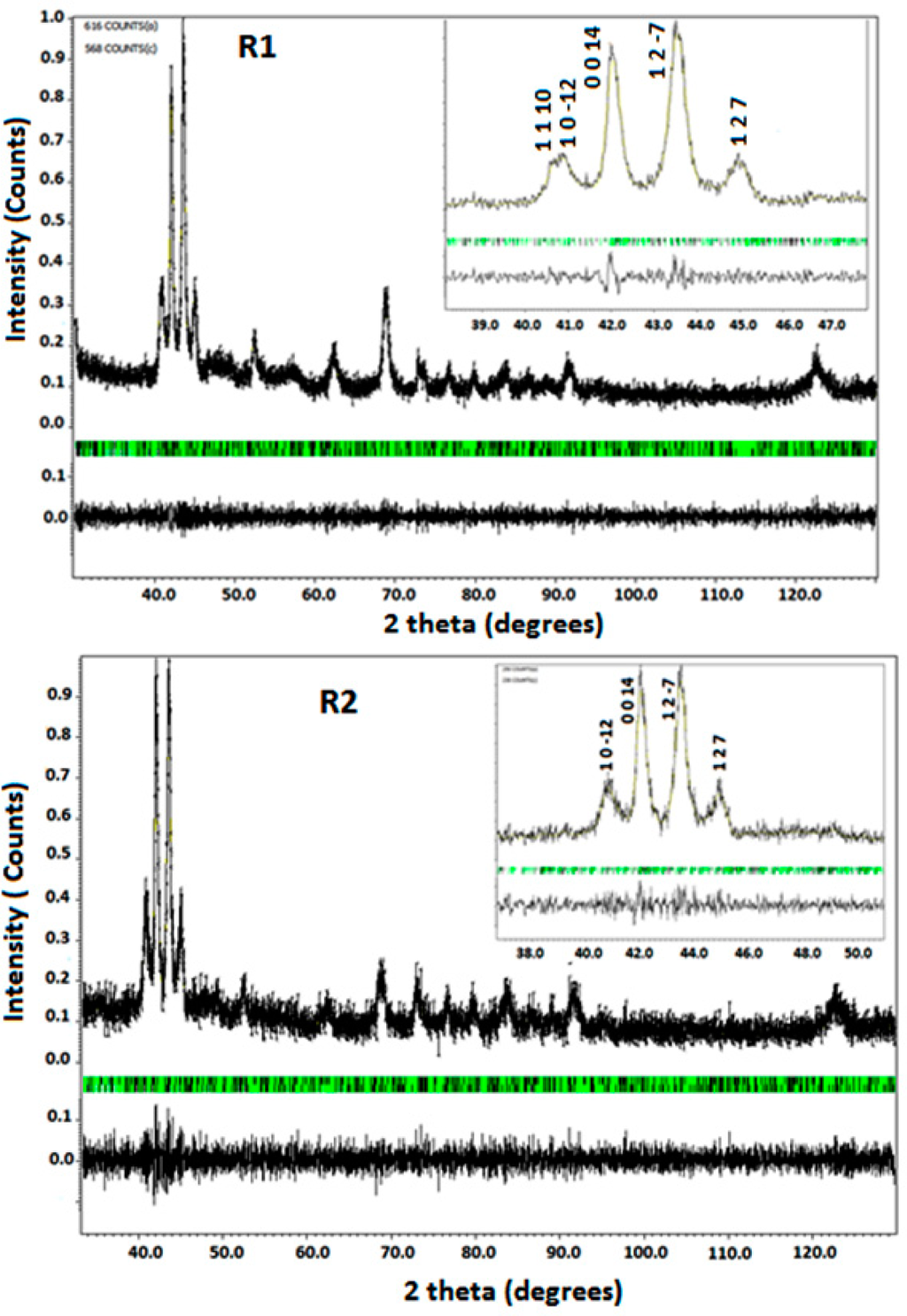 Rietveld graphical output of the structural refinement of the modulated martensite phase (samples R1 and R2). The black and green ticks specify the main reflections and satellites, respectively. The inset shows the selected areas in a range of 2θ values.