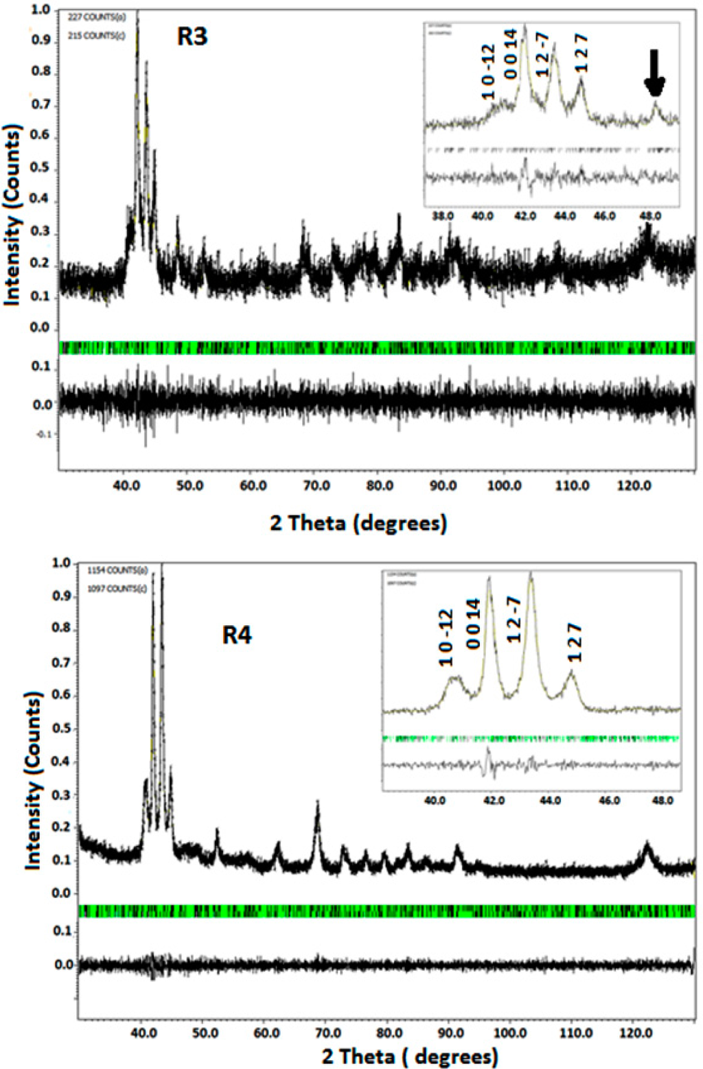 Rietveld graphical output of the structural refinement of the modulated martensite phase (samples R3 and R4). The black and green ticks specify the main reflections and satellites respectively. The inset shows the selected areas in a range of 2θ values. The arrow indicates the bump corresponding to 2θ position of the second-order satellite with respect to the 0 0 14 main reflection.
