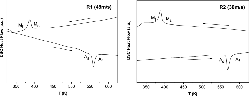 It is found that the characteristic transformation temperatures are very sensitive to the production conditions. For example, the ribbon produced with the lowest linear wheel speed (R1) has also the lowest values of the Eel and Wd terms. In addition, by increasing the wheel linear speed, both values increase. Thus, the melt spinning processing parameters influence more the microstructure (grain size) and the transformation temperatures than the crystallographic structure.