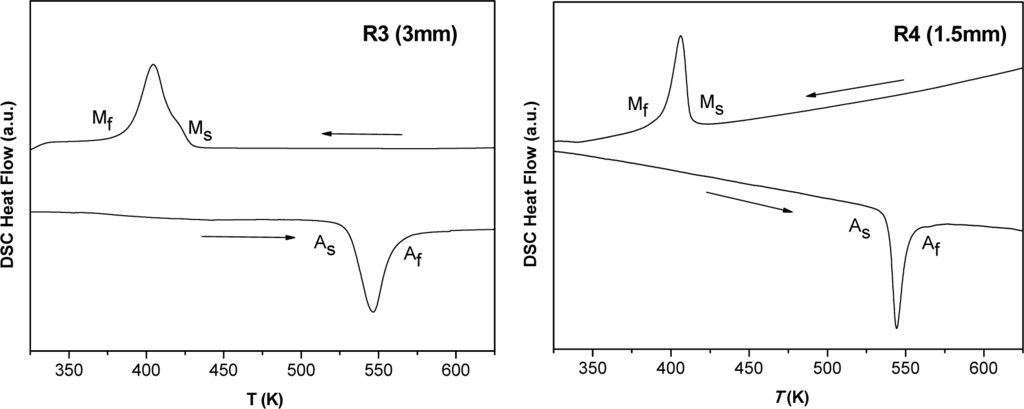 Transformation temperatures (As, Af, Ms, Mf) and heat exchange are determined from DSC scans. From Equations (5)–(7) the following four parameters are unknown: ΔH, ΔS, Eel and Wd. By combining previous equations with the thermodynamic equilibrium conditions it is possible to determine the relative fraction of Eel and Wd from the enthalpy of the transformation: Eel/ΔH and Wd/ΔH. For ΔH we use the average between cooling and heating data.