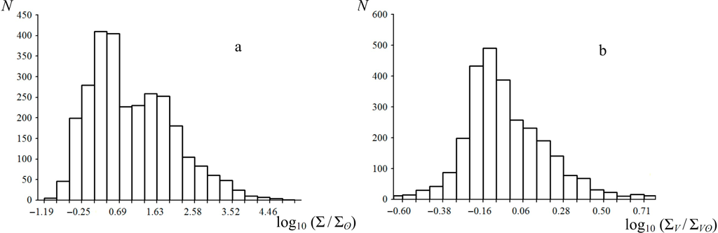 Bar charts for distribution of total Σ (a) and specific ΣV (b) entropy production of the main-sequence stars (all the studied stars of 11 clusters are shown). N is the number of stars falling into the range. For clarity, Σ and ΣV are normalized to solar magnitudes and presented in logarithmic form.