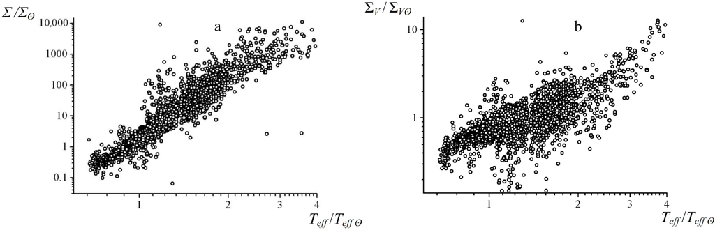 For ease of analysis, the data below was normalized to solar magnitudes that we had calculated on the basis of Equations (1)–(6) and the reference information contained in [31,32]. Their values are as follows: Teff ʘ = (57 ± 2) × 102 K, Lʘ = (3.8 ± 0.6) × 1026 W, Σʘ = (9 ± 1) × 1022 W·K−1, and ΣV ʘ = (6 ± 2) × 10−5 W·K−1·m−3. These results conform well with the data given in [14,15,27].