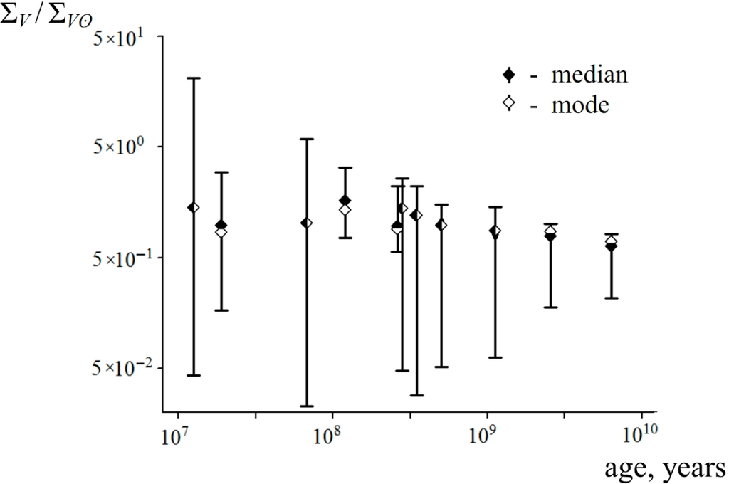 Data related to the entropy production of stars with different masses is given above. As is seen, ΣV changes insignificantly for the stars belonging to MS. To study this quantity in more detail, let us consider distribution of ΣV for stars belonging to the same cluster. Examples of frequency bar charts of ΣV as well as the dependence of ΣV on age are shown in Figures 4 and 5. It is seen that, independent of the age of an open star cluster, the distribution of specific entropy production remains almost the same in terms of both position and type. The majority of stars belonging to the cluster have specific entropy productions very similar to the solar one; and this value is almost independent of the ages which differ by three orders of magnitude. These results are no surprise. Indeed, as is well known, the overwhelming majority of stars in a cluster are MS stars. The fraction of high-temperature stars in a cluster decreases with age (by evolving, these stars move to the right of the main sequence. So, the older the cluster is, the less high-luminosity stars belong to the main sequence). However, the number of these stars relative to the total number of MS stars is rather small; and additionally, the values of ΣV of the stars leaving the main-sequence show little difference from ΣV of those remaining (see Figures 1–3). All this makes the result illustrated in Figures 4 and 5 predictable. Furthermore, there is one interesting result here: according to the calculations made, the range of ΣV, where the majority (90%) of cluster stars is distributed, shrinks with age (approximately in 35 times) (Figure 4). Such a shrinkage occurs for both high and low specific entropy productions. Whereas the former can be explained by the decrease of the fraction of high-temperature stars, the reasons of the latter are not completely known and require further investigation.