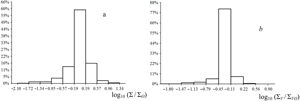 As is seen from the above, the quantities Σ and ΣV can be found from direct photometric measurements. For this reason, only their values are calculated and analyzed below. Mass-specific entropy production ΣM, another known quantity of non-equilibrium thermodynamics, is not considered herein. This is connected with the fact that in order to determine a star’s mass, some theoretical stellar model is required, and therefore, additional assumptions are necessary. As a result, the calculation of ΣM turns out to be combined rather than based on experimental data only. This complicates the analysis of ΣM calculation error.