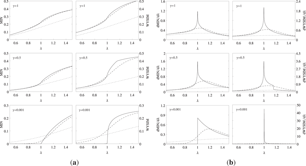 (a) The thermal total correlations quantified by measurement-induced nonlocality (MIN) and the Wigner–Yanase skew information-based measure (WYSIM) as a function of λ for γ = 0.001, 0.5, 1 at kT = 0 (solid line), kT = 0.1 (dashed line) and kT = 0.5 (dotted line). (b) The first derivatives of MIN and WYSIM as a function of λ for γ = 0.001, 0.5, 1 at kT = 0 (solid line), kT = 0.1 (dashed line) and kT = 0.5 (dotted line). The graphs are for the first nearest neighbors.