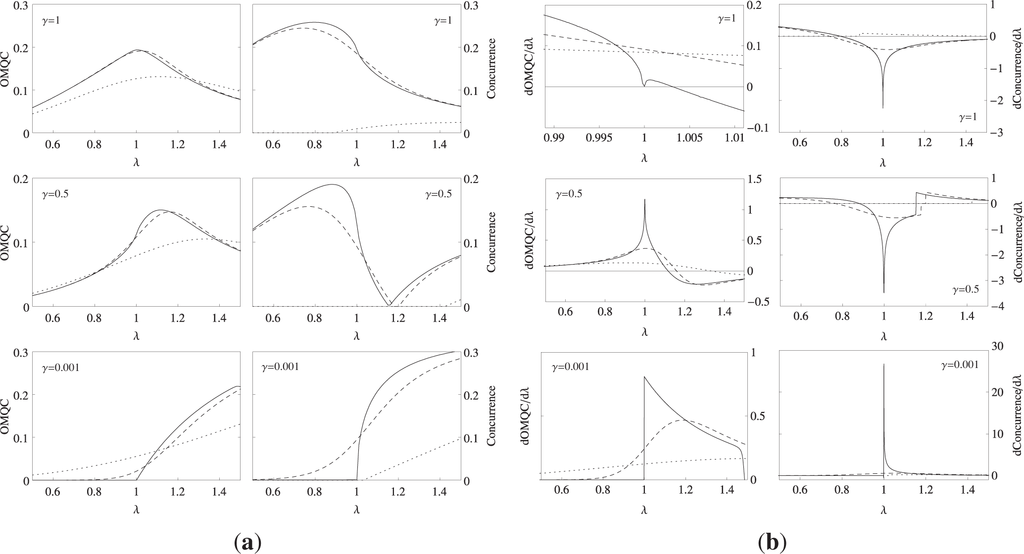 (a) The thermal quantum correlations quantified by observable measure of quantum correlations (OMQC) and concurrence as a function of λ for γ = 0.001, 0.5, 1 at kT = 0 (solid line), kT = 0.1 (dashed line) and kT = 0.5 (dotted line). (b) The first derivatives of OMQC and concurrence as a function of λ for γ =0.001, 0.5, 1 at kT = 0 (solid line), kT = 0.1 (dashed line) and kT = 0.5 (dotted line). The graphs are for first nearest neighbors.