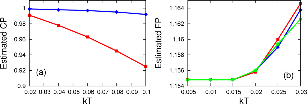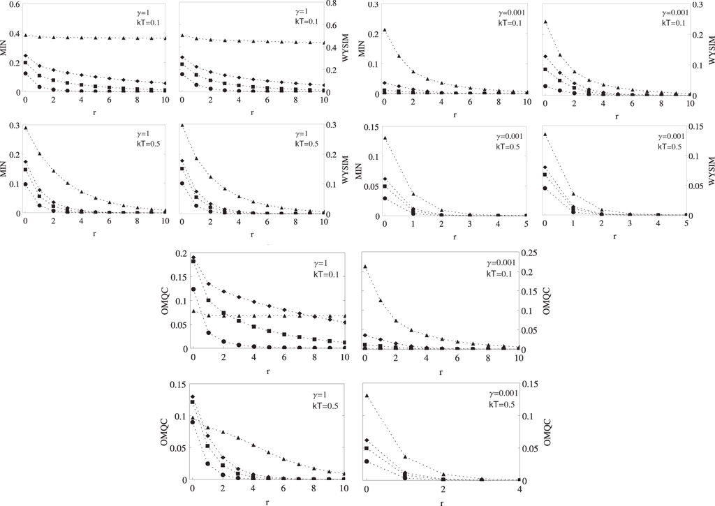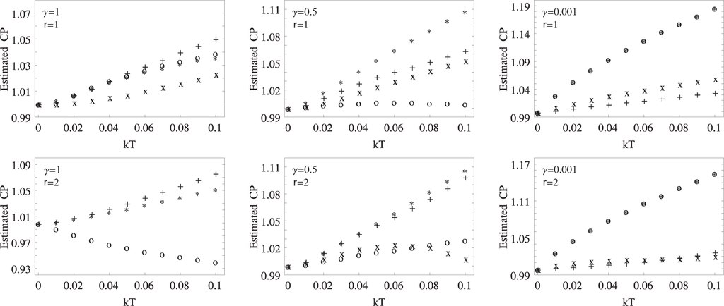 The estimated values of the CPas a function of kT for three different values of the anisotropy parameter γ = 0.001, 0.5, 1. The CPs in the graphs are estimated by OMQC (denoted by o), WYSIM (denoted by +), MIN (denoted by *) and concurrence (denoted by x). Concurrence is not included for γ = 1 and r = 2, since it vanishes at even very low temperatures.