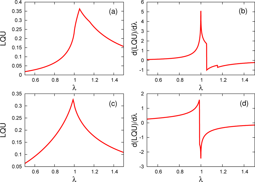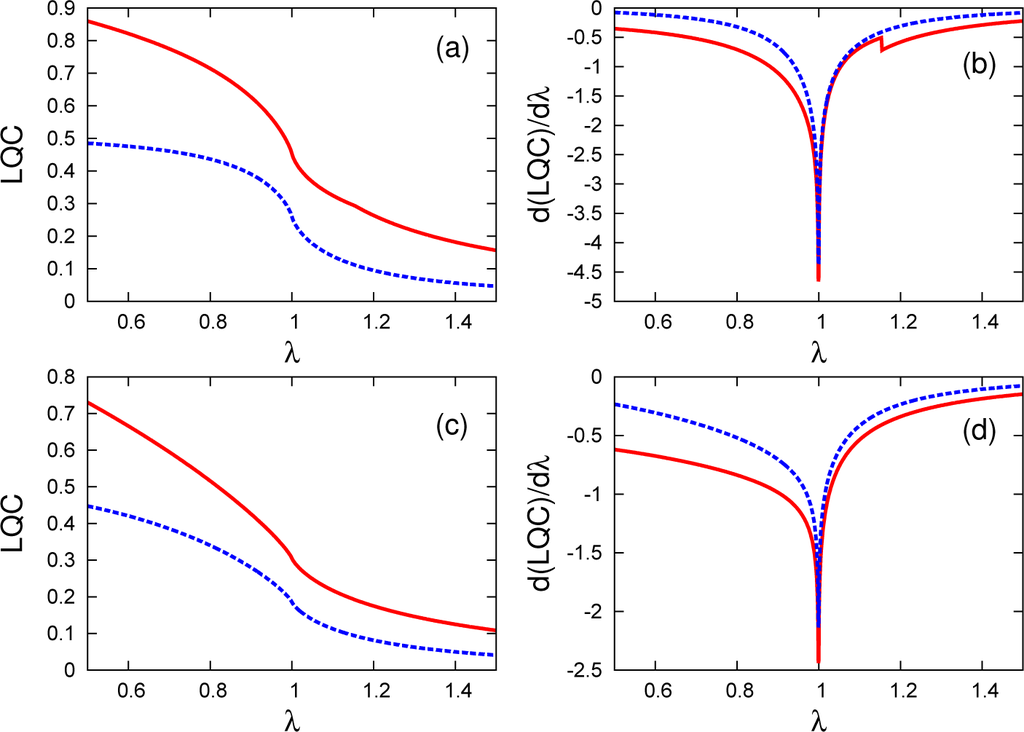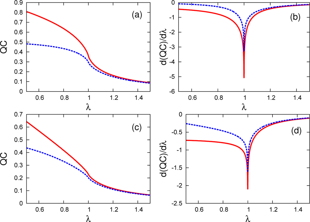 Focusing on the signatures of the factorization phenomena, we first observe that for γ = 0.5, concurrence becomes exactly zero at the factorization field λf ≈ 1.15, which can be calculated from Equation (1). More interestingly, in all of the remaining three correlation measures considered in this work, only WYSIM is able to detect the existence of the factorized ground state by a non-analytic behavior in its derivative. This is a rather peculiar property of WYSIM, since, as mentioned, we do not take into account the effects of SSB. No other correlation measure in the literature is capable of revealing this phenomena without explicitly considering the effects of SSB with a single evaluation of the measure. The intersection point of the QD calculated using the thermal (symmetry protected) state for different spin distances can detect factorization in this model; however, for WYSIM, a single calculation is sufficient.