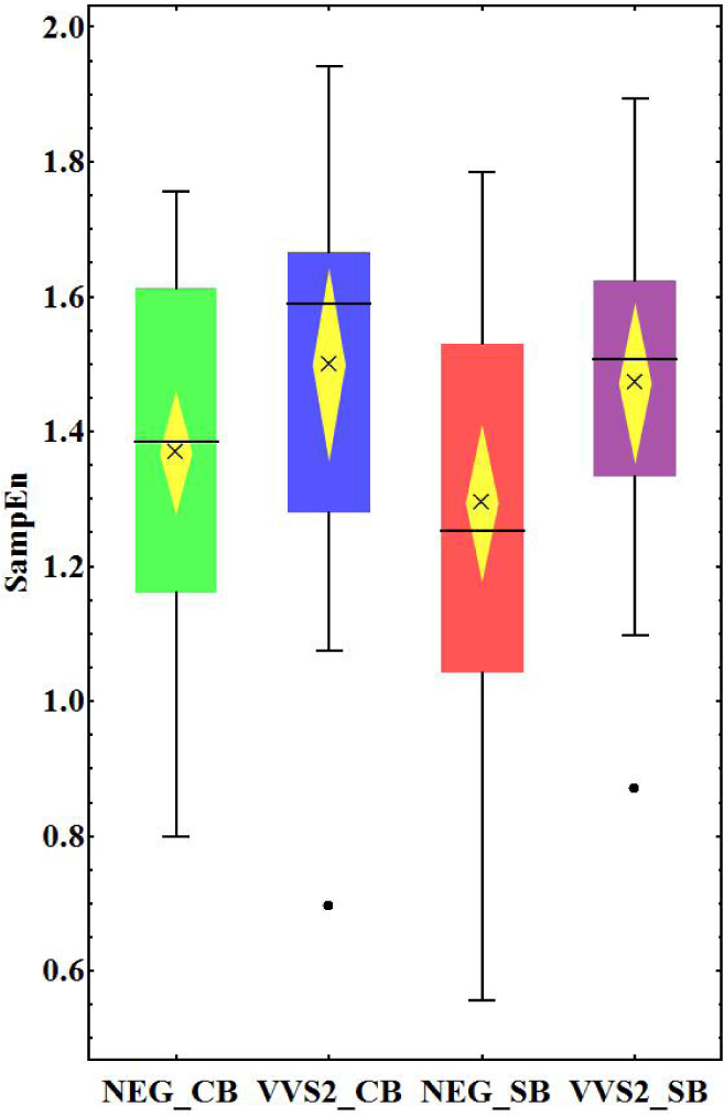 SampEn in all studied subgroups (horizontal whiskers depict the upper and lower fence (Q1-1.5IQR, Q3+1.5IQR), where IQR = Q3-Q1 and Q1, Q3 are quartiles, x denotes the mean value and the yellow diamond depicts the mean confidence interval).