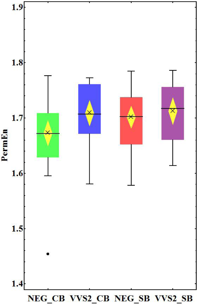 PermEn in all studied subgroups (horizontal whiskers depict the upper and lower fence (Q1-1.5IQR, Q3+1.5IQR), where IQR = Q3-Q1 and Q1, Q3 are quartiles, x denotes the mean value and the yellow diamond depicts the mean confidence interval).