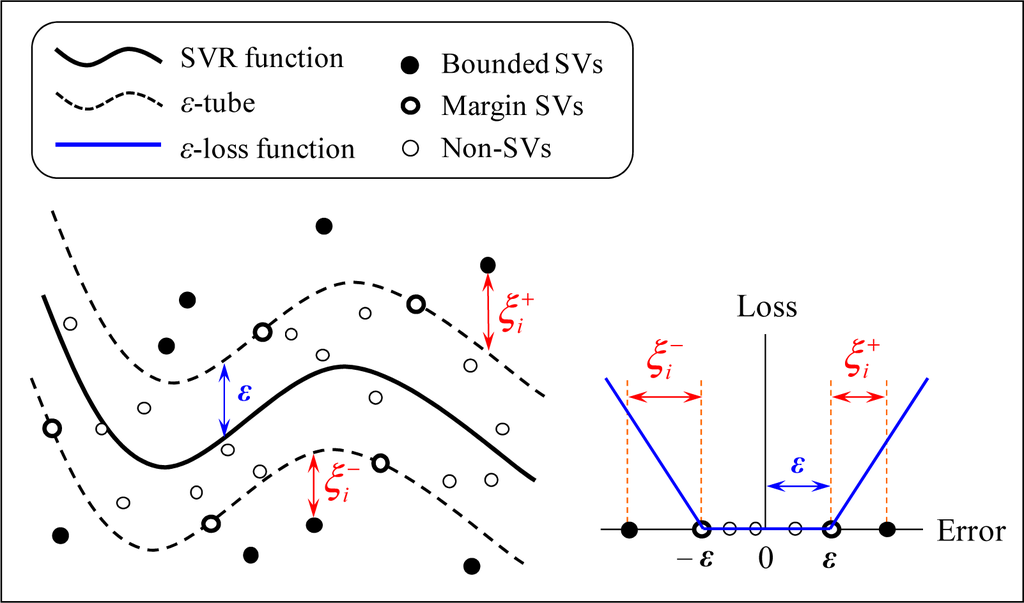 equal to C are called bounded SVs. The margin SVs are located on the margin of the ε-tube, and the bounded SVs are outside the tube (Figure 1). Finally, the SVR function can be expressed as follows: