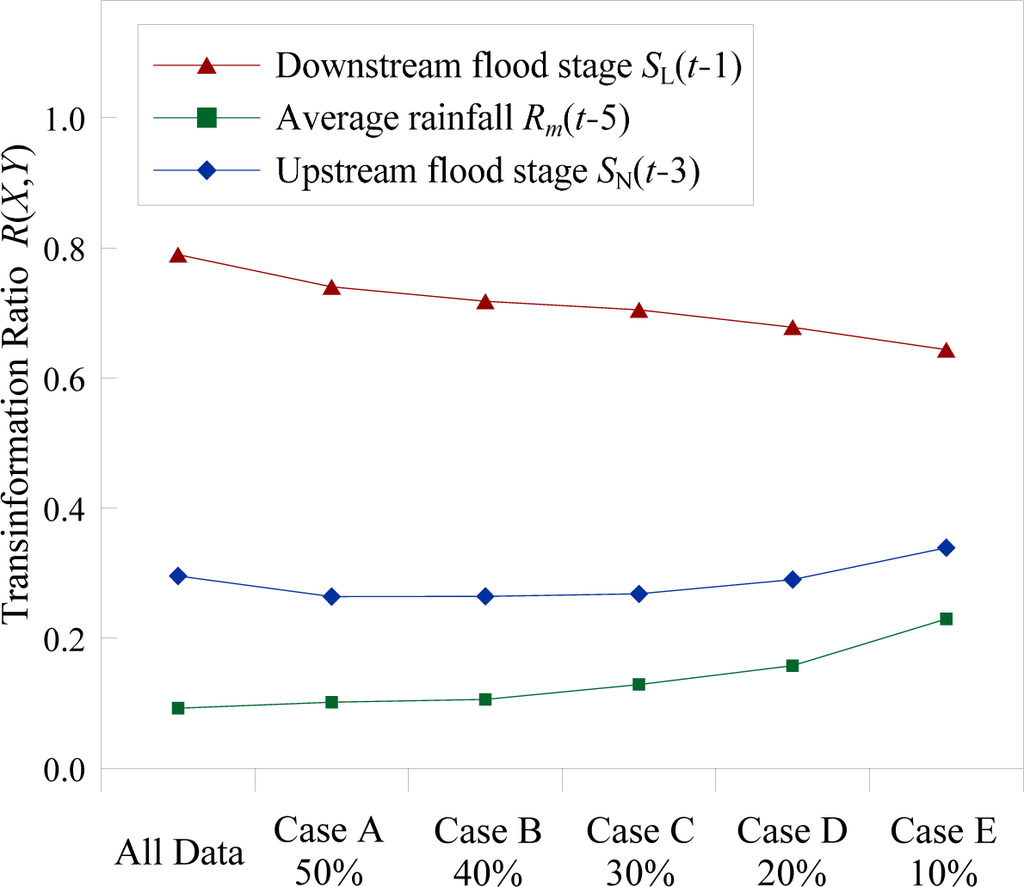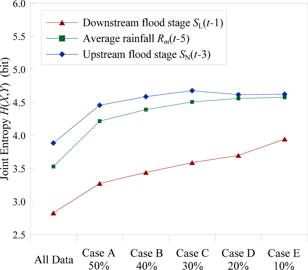 Figure 10 shows the joint entropies of all and mined data regarding the output variable and three respective input variables. The joint entropy measures the combined information of two variables. Figure 10 shows that the joint entropies generally increased as the amount of mined data decreased. The joint entropies of SL(t) and SL(t − 1) were the lowest because these two variables contained similar types of information. However, the joint entropies of SL(t) and SL(t − 1) were higher than the marginal entropy of SL(t), indicating that the pair of successive flood stages provided more information on the floods than only one flood stage did. The joint entropies of SL(t) and SN(t − 3) were higher than those of SL(t) and Rm(t − 5), although they were close with respect to 20% and 10% of the data. The results of joint entropies in Figure 10 show that a Muskingum-type river routing model constructed using the downstream and upstream stage variables, SL(t) and SN(t − 3), may be more effective than a rainfall-runoff (or rainfall-stage) model constructed using the rainfall and downstream stage variables, Rm(t − 5) and SL(t), in terms of the total information used to describe the hydrologic process. Moreover, these two hydrologic models may outperform an autoregressive model constructed using SL(t) and SL(t − 1).