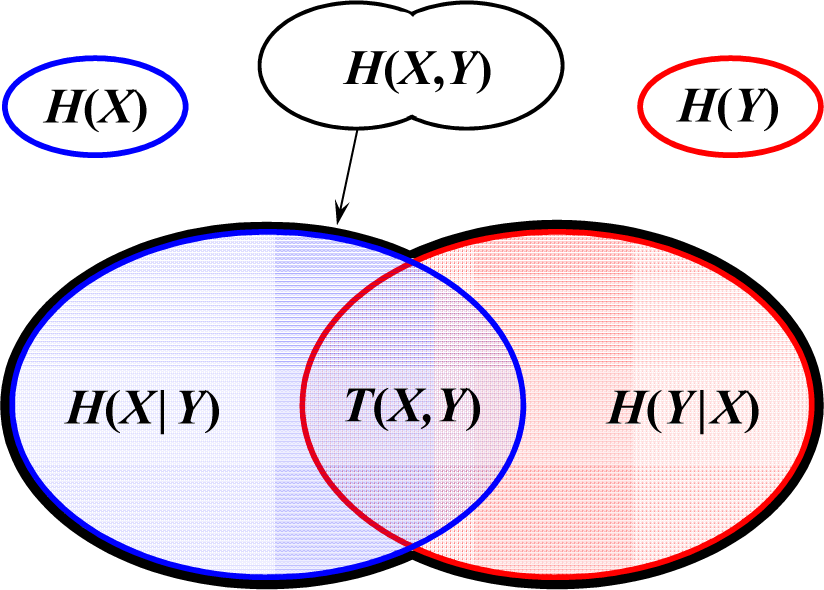 where T(X,Y) is transinformation indicating the information that can be transferred from X to Y, or vice versa. Transinformation, also known as mutual information, is symmetrical so that T(X,Y) = T(Y,X). Transinformation is the partial information of one variable that can be obtained when a second variable is known. In other words, it is a measure of the shared information contained in one variable about a second variable. Figure 2 shows an information diagram illustrating the relationships among various entropies of two variables.