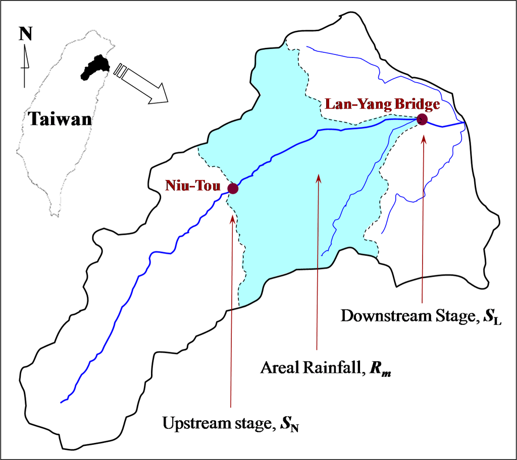 Hourly hydrologic data, namely flood stage and rainfall data in the Lan-Yang River basin in Taiwan, were used. The flood stage data were from two water level stations, the downstream Lan-Yang Bridge Station and upstream Niu-Tou Station, and the rainfall data were records of the areal rainfall accumulated in the catchment area between Lan-Yang Bridge and Niu-Tou Stations. Figure 3 presents the map of Lan-Yang River basin and the location of stations. The distance between the upstream and downstream stations is approximately 25 km. Complete records of flood stage and rainfall data measuring flood events were obtained, and 12 flood events from 1990 to 2001 were used for model development.