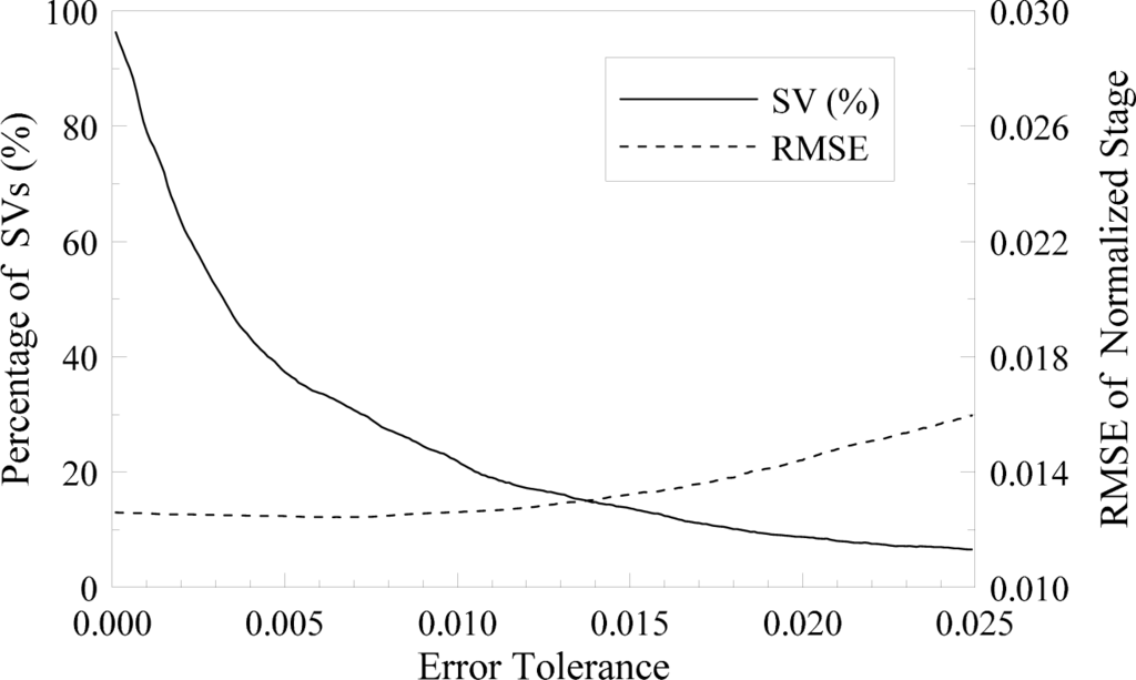 Relationship between error tolerance ε and the percentages of SVs, as well as between ε and the RMSE in [].