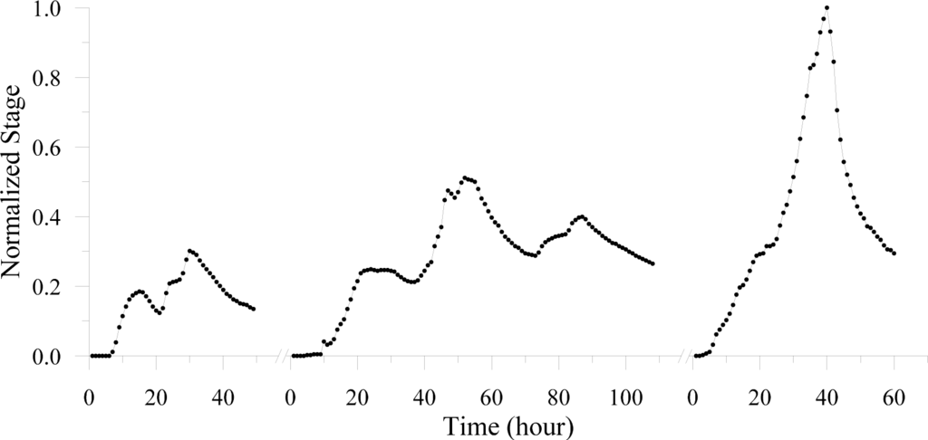 Small, medium, and large flood events used to demonstrate the mining of informative hydrologic data.