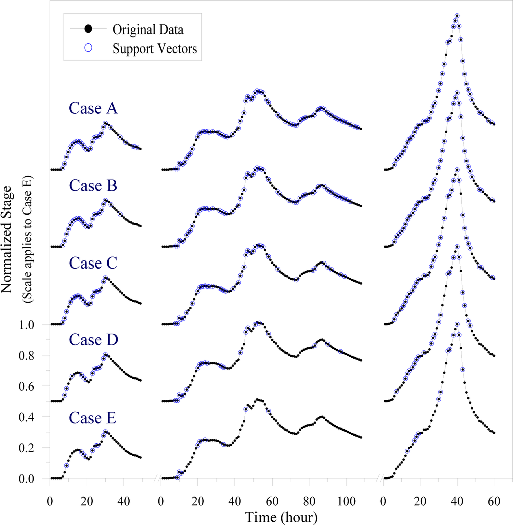 To demonstrate the mining results, Figure 5 shows three flood events of typical small, medium, and large sizes on a scale of normalized flood stages. Figure 6 illustrates the process of pruning SVs from 50% to 10% (Cases A to E), and shows that informative flood data, particularly the data around the peak stage and in the rising limb, were typically mined as SVs. The results of the data mining process are described as follows []: (1) data around the peak stage were mined as SVs; (2) a majority of data in the rising limb of the hydrograph remained SVs; and (3) data in the recession limb were eliminated during the data mining process. These results prove that informative data that characterized the flood hydrograph were mined as SVs, and that SVs obtained using the proposed SVR model represent informative hydrologic data. Moreover, the SVR flood forecasting models constructed using fewer SVs performed equally well in providing real-time flood forecasting as those constructed with more SVs did [], indicating that the pruned SVs contained sufficient information to describe the flood process. The SVs mined using the SVR method were hydrologically interpreted as informative data, and the following section describes the use of entropy indices to quantify the amount of information in the mined informative hydrologic data.