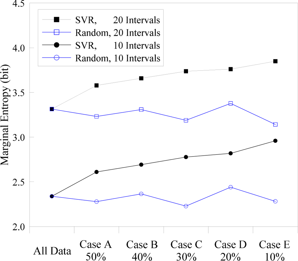 Figure 7 also shows that the entropies of mined data increased as the number of SVs decreased, but the entropies of the randomly selected 50% to 10% of the data (the same number as those of the SVs in Cases A to E) were comparable. This phenomenon can be explained in terms of data compression; compressed data contain less redundancy and have higher entropy. If a data set contains an excessive amount of unnecessary information, then it is more redundant and less informative. Therefore, the higher the entropy, the more informative and less redundant a data set is. Redundant flood data in the mined SV data sets were pruned, causing the data sets to become compressed and more informative. Therefore, the mined SVs were more compact and had higher entropy. The randomly selected data sets had similar characteristics (redundancy or information) as the original data set did; therefore, the entropies were comparable. Accordingly, the SVs mined using the SVR method were determined to be meaningful and informative hydrologic data based on entropy theory.