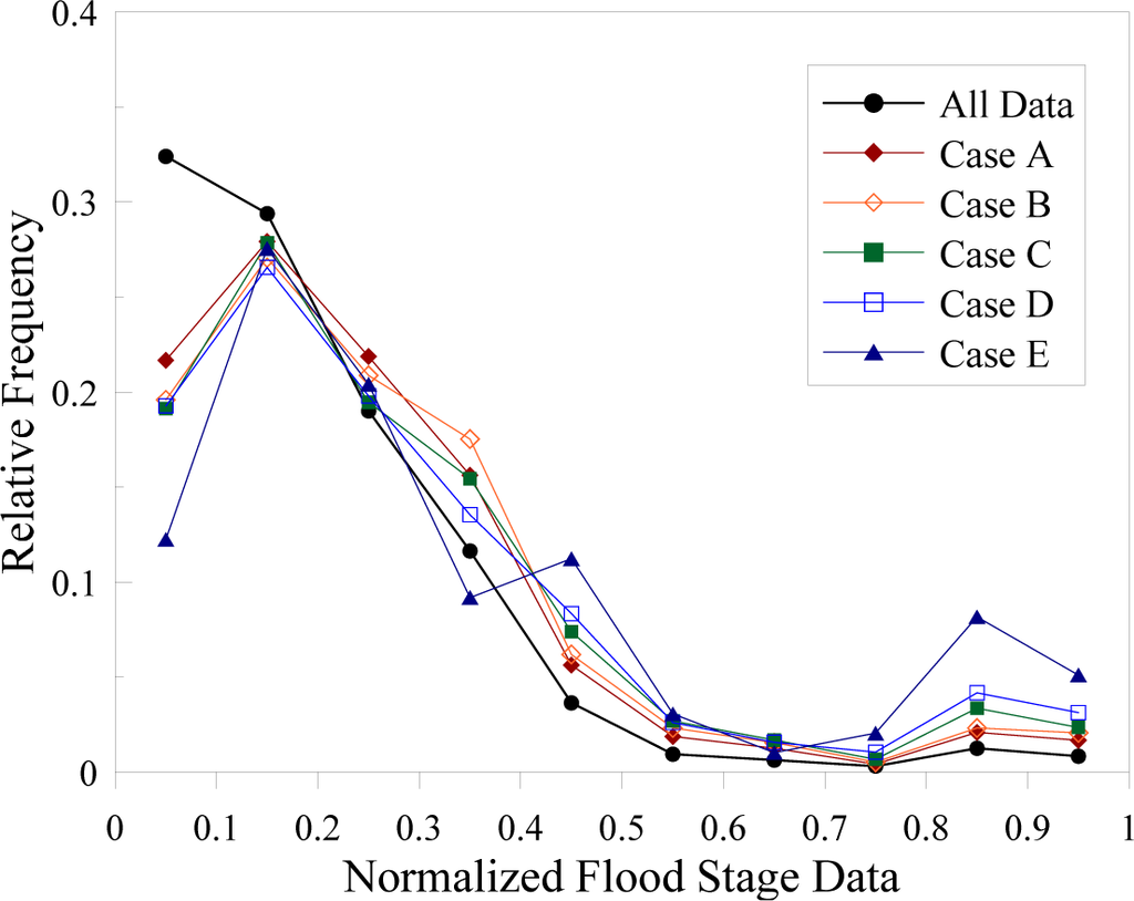 Figure 8 shows the relative frequencies related to various class intervals of the normalized flood stage data. In the data mining process from Cases A to E, the percentages of low stage data decreased and the percentages of high stage data increased. The relative frequency curves in Figure 8 provide additional information on the percentages of mined SVs, and confirm that higher flood stages are mined as SVs and lower flood stages tend to be pruned.