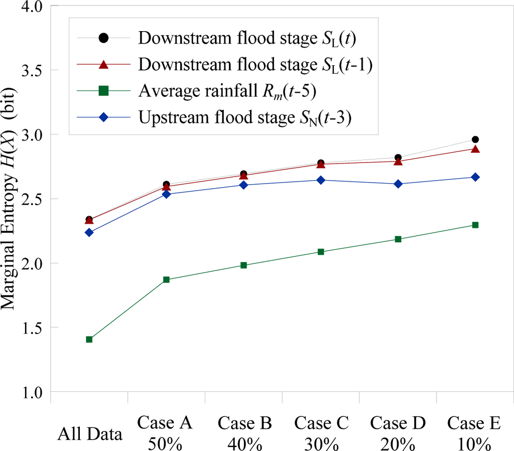 Figure 9 shows the marginal entropies of all and mined data regarding the four variables. The marginal entropy is a measure of the average amount of information contained in a hydrologic variable. The marginal entropies of the four variables increased as the number of mined data decreased, indicating that the SVR method mined informative hydrologic data regarding these variables. Two downstream stage variables (with a lag of 1 h) showed similar entropies. The output variable SL(t) had a slightly higher entropy than the input variable SL(t − 1) did, suggesting that the SVR model mined the SVs by forecasting the output variable; therefore, the output variable showed a slightly higher entropy. This also explains the entropies regarding the output downstream stage SL(t) and input upstream stage SN(t − 3); the entropies of SL(t) were higher than those of SN(t − 3) were. The marginal entropies of the rainfall variable Rm(t − 5) were lower than those of the stage variables. Regarding the hydrologic process, rainfall provided indirect and less concrete information on a flood event than the stage did. Therefore, the flood stage was a more informative hydrologic variable than rainfall.