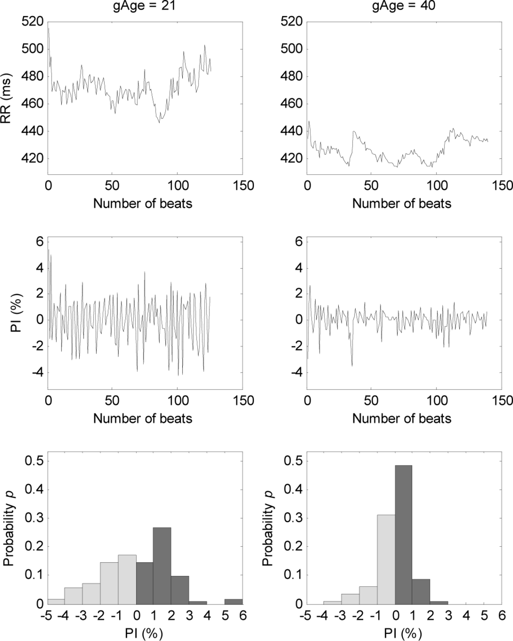 Foetal well-being during pregnancy has been widely evaluated with fluctuations of foetal heart rate or foetal heart rate variability (fHRV) monitoring. However its usefulness in detecting foetal acidemia has recently been questioned [1]. One reason is that clinical interpretation can sometimes differ because beat to beat fetal heart rates were not extracted from foetal electrocardiogram signals which is the most reliable method for quantifying beat to beat heart rates. Early in gestation the foetal heart rate is predominately under the control of the sympathetic nervous system and arterial chemoreceptors [2]. As the foetus develops its heart rate decreases in response to parasympathetic (vagal stimulation) nervous system maturation and variability becomes more pronounced [3]. In the normal foetus, there is an interplay between the sympathetic (acceleration) and parasympathetic (deceleration) nervous systems in the control of heart rate. These systems exert their control via the cerebral cortex, the medulla oblongata, the sympathetic ganglia and the vagus nerve. The interaction between these systems results in a difference in the beat-to-beat intervals resulting in variability of the foetal heart rate tracing. In the term foetus, moderate variability is considered normal as it indicates a normally functioning central nervous system. Beat-to-beat or short-term variability is the oscillation of the FHR around the baseline in amplitude of 5 to 10 bpm. Long-term variability is a somewhat slower oscillation in heart rate and has a frequency of three to 10 cycles per minute and an amplitude of 10 to 25 bpm. Clinically, loss of beat-to-beat variability is more significant than loss of long-term variability [4]. Gestational age is an important factors that require consideration when assessing the foetal heart rate variability. The completion of the 35 gestational week marks a developmental milestone that is associated with a dramatically decreasing risk for the neonate in the case of a preterm delivery. About 90% of babies born this week can survive. Lungs are almost fully developed.